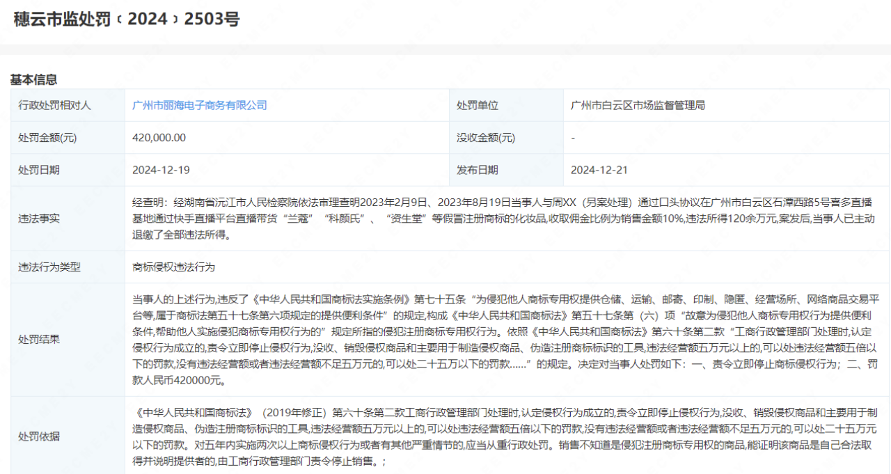 企查查数据库的行政处罚决定书《穗云市监处罚﹝2024﹞2503号》显示,广州市丽海电子商务有限公司(以下简称“广州丽海”)在快手直播平台销售假冒注册商标的化妆品,违法所得高达120余万元。