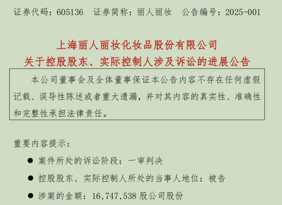 2024年12月31日晚,上海丽人丽妆化妆品股份有限公司(以下简称“丽人丽妆”,证券代码:605136)发布公告称,公司控股股东、实际控制人黄韬与其前妻翁淑华的离婚财产分割案一审结果正式公布。