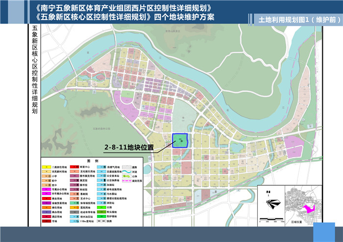 控制导则增加第5、6、7条。其中第5条:设计海绵城市规划控制内容参照《南宁市海绵城市规划设计导则》相关规定执行。第6条:2-8-11-2地块临水系一侧第一排建筑限高不超过60米。第7条:2-8-11-2地块预留公共活动场地,按广场用地进行建设指标控制。
