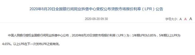 20日,中国人民银行授权全国银行间同业拆借中心公布,2020年8月20日贷款市场报价利率(LPR)为:1年期LPR为3.85%,5年期以上LPR为4.65%。与7月报价保持一致。