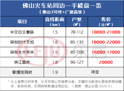 据统计,目前佛山火车站周边3公里范围内(百度测距直线距离)在售/待售楼盘约有5个,在售住宅均价约1.6-2.2万/㎡。