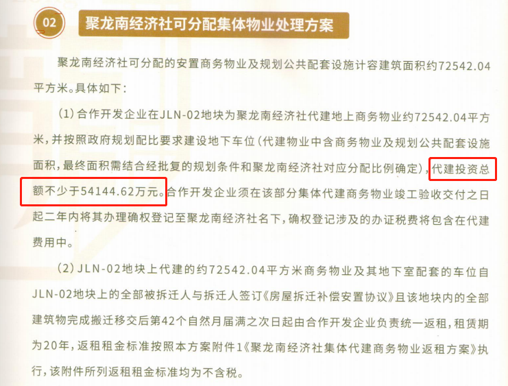 其中,在待建72542.04㎡的集体物业上,合作企业(即保利)投资额不低于54144.62万元,并由保利返租20年,合计收益约79414万元。