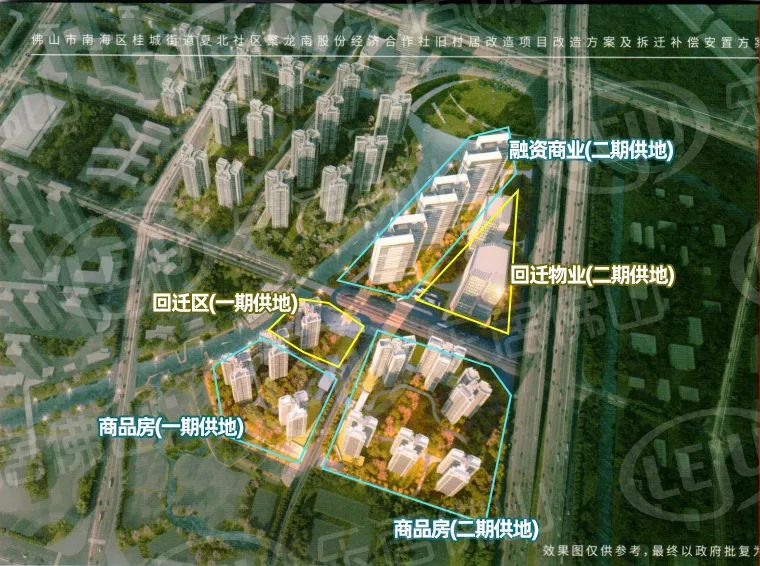 聚龙南村位于南海区桂城街道夏北社区,改造范围总用地面积10.6262万㎡,折合约159亩。本项目为旧村居改造,采用整体拆除重建的方式、选取市场主体实施,以协议出让的供地方式进行改造,分为融资区、回迁区及其他公共配套区。