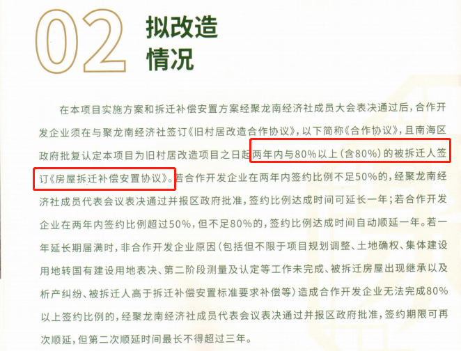 经聚龙南经济社成员大会表决通过后,且南海区政府批复认定后,保利须在2年内与80%以上被拆迁人签订《房屋拆迁补偿安置协议》。