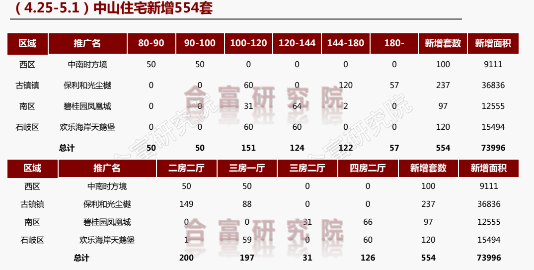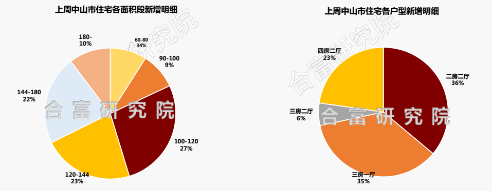 根据合富研究院监测:上周中山有4个住宅项目新增,共554套,新增货量为7.4万㎡。在上周住宅各面积段新增里,100-120㎡面积段新增最多,为151套,占比均为27%;上周住宅各户型新增里,最多为二房二厅户型共200套,占比36%。
