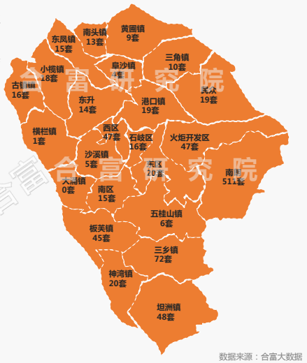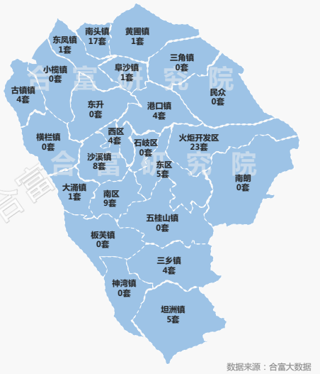 根据合富研究院数据监测:截止至2022年5月1日,中山市住宅库存55263套,631万㎡,环比基本持平。其中火炬开发区7980套居全市镇区住宅库存榜首,三乡镇5923套排名第二,南朗4744套排名第三。