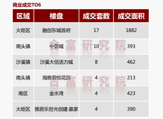 根据合富研究院监测:上周全市商业成交为87套,1.5万㎡,环比上升10%。在上周中山市各镇区商业成交排名里,火炬开发区成交23套排名第一,多为融创东城首府成交;南头镇成交17套排名第二,多为中荟城成交;南区成交9套排名第三,多为金水湾成交。