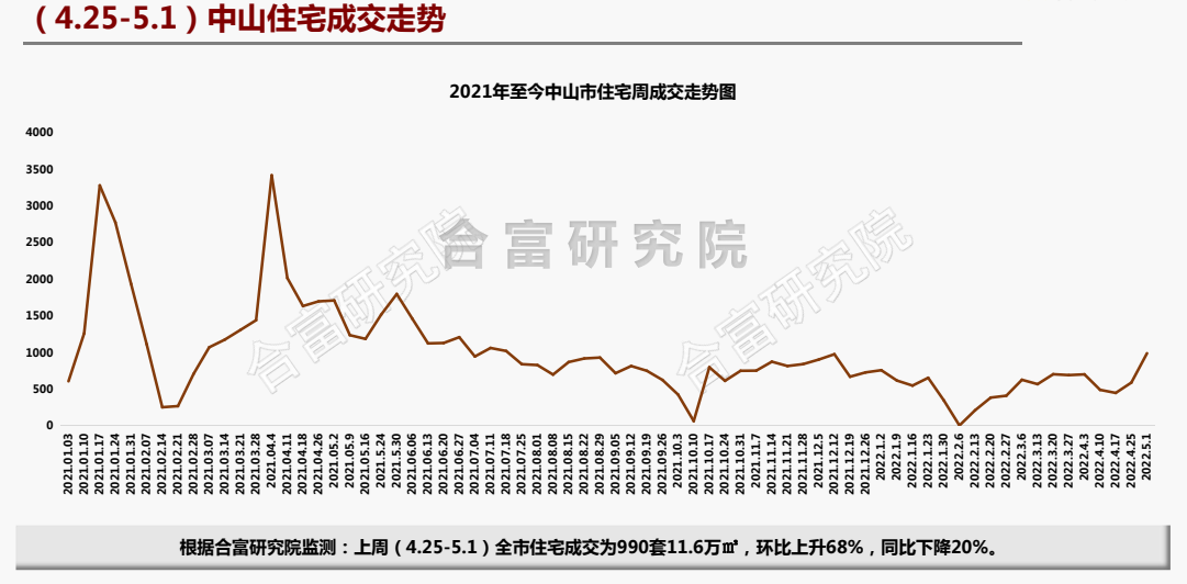 根据合富研究院监测:上周(4.25-5.1)全市住宅成交为990套,11.6万㎡,环比上升68%,同比下降20%。