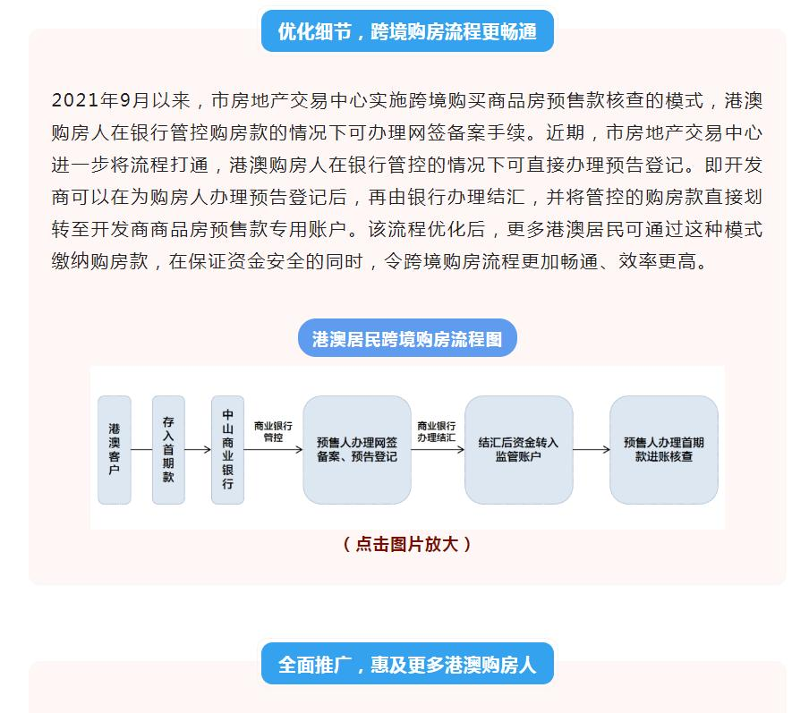 整体优化了业务细节,跨境购房流程更畅通;全面推广,惠及更多港澳购房者,港澳居民中山购房将更便利。