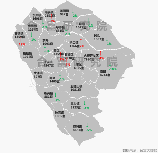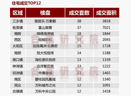 根据合富研究院监测:上周全市住宅成交为990套,11.6万㎡。在上周中山市各镇区住宅成交排名里,南朗成交511套排名首位,其中以锦绣海湾城成交最多;三乡镇成交72套排名第二,其中以雅居乐·万象郡成交最多;坦洲镇成交48套排名第三,其中多为中澳春城成交。