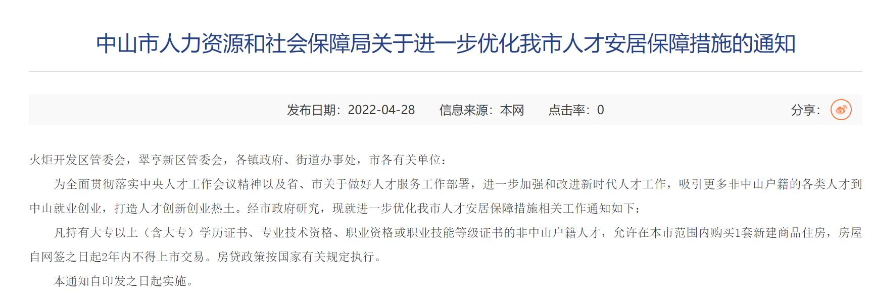 市委组织部联合其他8部门合印发了《中山市新时代人才高质量发展二十三条》,文中提到:“高层次人才购房待遇,具体为:高层次人才凭相关人才证明,在购买商品住房时可享受本市户籍居民同等待遇。”