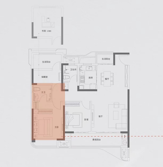 南向客厅开间约3.6米,客厅和主卧、次卧三开间朝南,约6.7米贯通式阳台连通客厅和南向次卧,采光能够得到保证,视野也比较开阔。北向次卧可做儿童房, 客卫三段式设计,动线合理,干湿分离。主卧为套房设计,带有独卫和步入式衣帽间,连接环形飘窗,生活动线私密合理。
