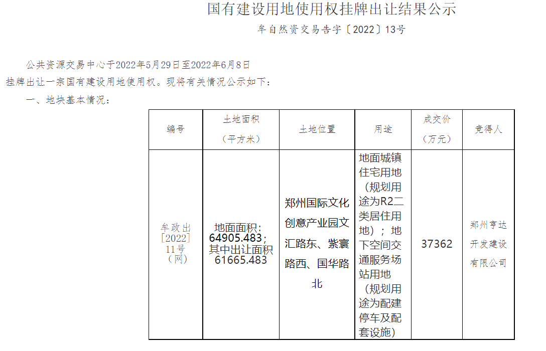 牟政出[2022]11号(网)地块竞得人是郑州亨达开发建设有限公司,成交价37362万元。