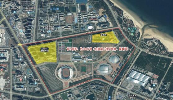 项目东起滨海中路及逛荡河,南为港城东大街,西至观海路,北到银海路,除去区域内南山世纪华府及星海湾小区两处居住用地,此次规划面积约100 公顷。