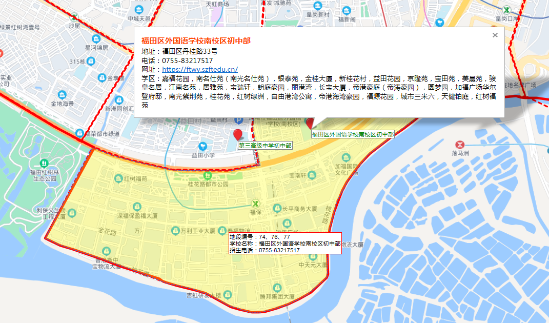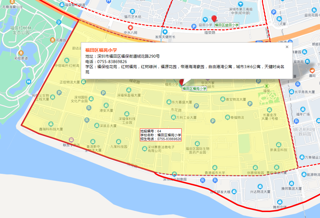 中信城开;红树湾小学所属学区为福苑小学,初中在福田外国语学校南校区学区范围内。福外南原名福田保税区实验学校,2018年新建成48班九年一贯制公办学校,并纳入到福田外国语教育集团。