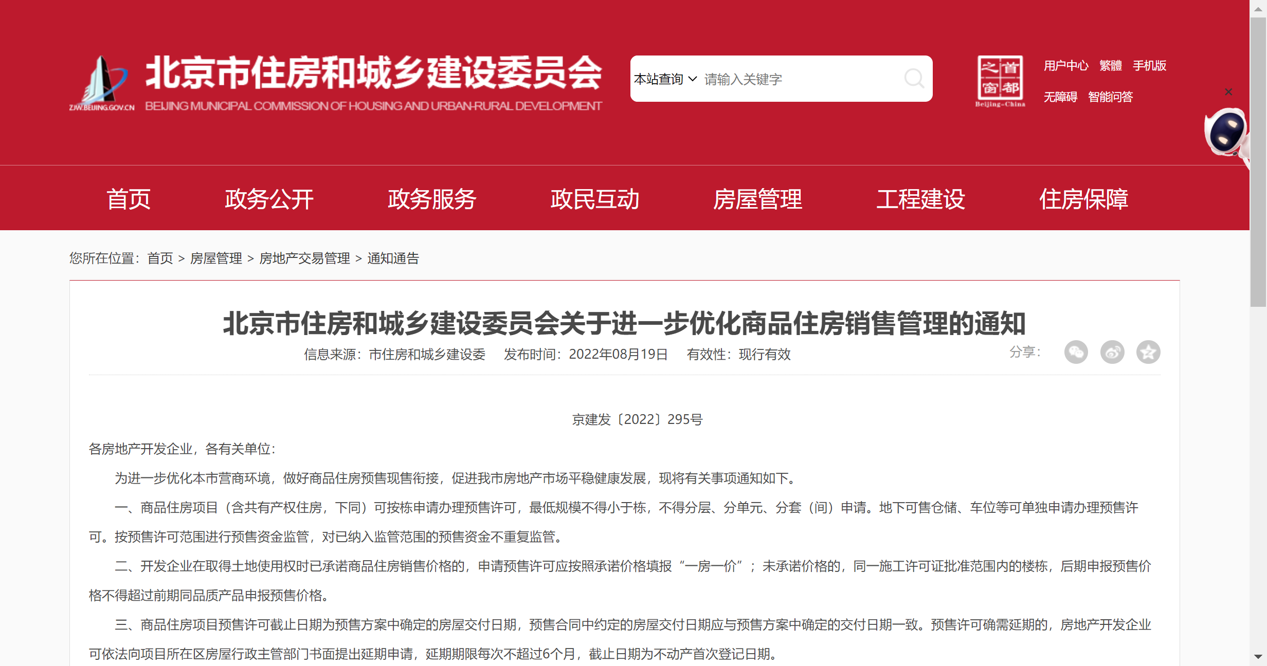 北京住建委进一步优化商品住房销售管理:预售资金按证监管 保交付