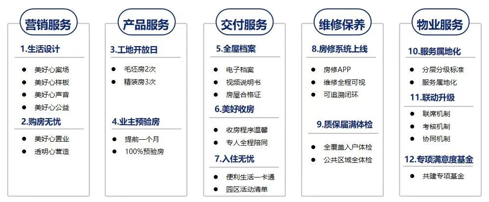 在保障产品兑现的基础上,一些房企致力于优化客户体验,搭建起全流程服务体系,如绿城、中海、碧桂园、越秀等。这些房企全面关注业主需求。通过工地开放、一对一验房、交房即交证、社群搭建、设施维护保养等一系列服务举措,塑造良好的客户满意度、美誉度和忠诚度,提升品牌价值。