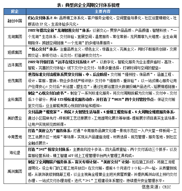 当前,在已经搭建交付体系的房企中,按体系的完整性和环节的偏重性可以分成三类:第一类是已经在集团层面搭建了完善的全周期交付体系,并在品牌上形成了强IP的交付力形象;第二类是交付体系重点聚焦前端建造施工环节,重标准、强品质;第三类是交付体系重点优化客户交付体验,搭建全流程服务体系。