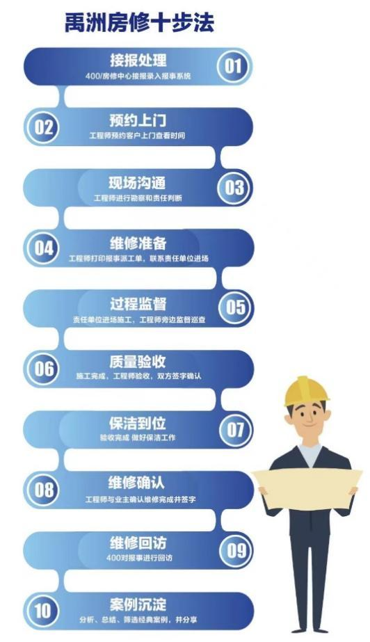 禹洲地产设立400呼叫中心客户服务、“禹洲会”服务号中“小禹儿客户大使”服务功能、“禹房宝”小程序等平台,对于在保修范围内的,小到管道阻塞,大至硬件损坏,均为业主提供及时、专业、高效的报修服务。为保证服务质量,禹洲坚持接报后30分钟响应,24小时受理,365天陪伴。同时,还相继出台《房修业务管理作业指引》、《禹洲房修十步法》等流程标准,规范服务体系,打磨服务品质,以匠心解决客户的后顾之忧。