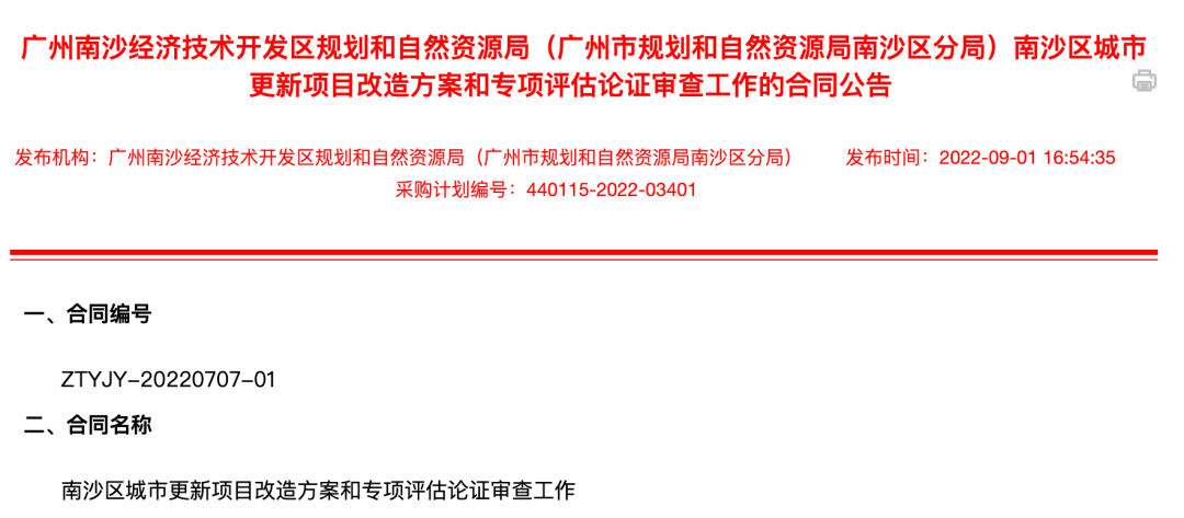 9月1日,南沙区城市更新项目改造方案和专项评估论证审查工作项目合同对外公示,采购方为广州南沙经济技术开发区规划和自然资源局,供应商为广州南沙新区规划设计研究院有限公司、广州市城市规划勘测设计研究院。上述合同金额为920万元,履行期限为2022年8月至2024年7月。