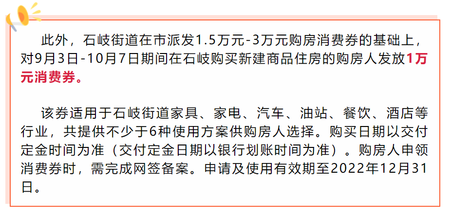 9月3日-10月7日期间,石岐在市派发1.5万元-3万元购房消费券的基础上,对在石岐购买新建商品住房的购房人发放1万元消费券。