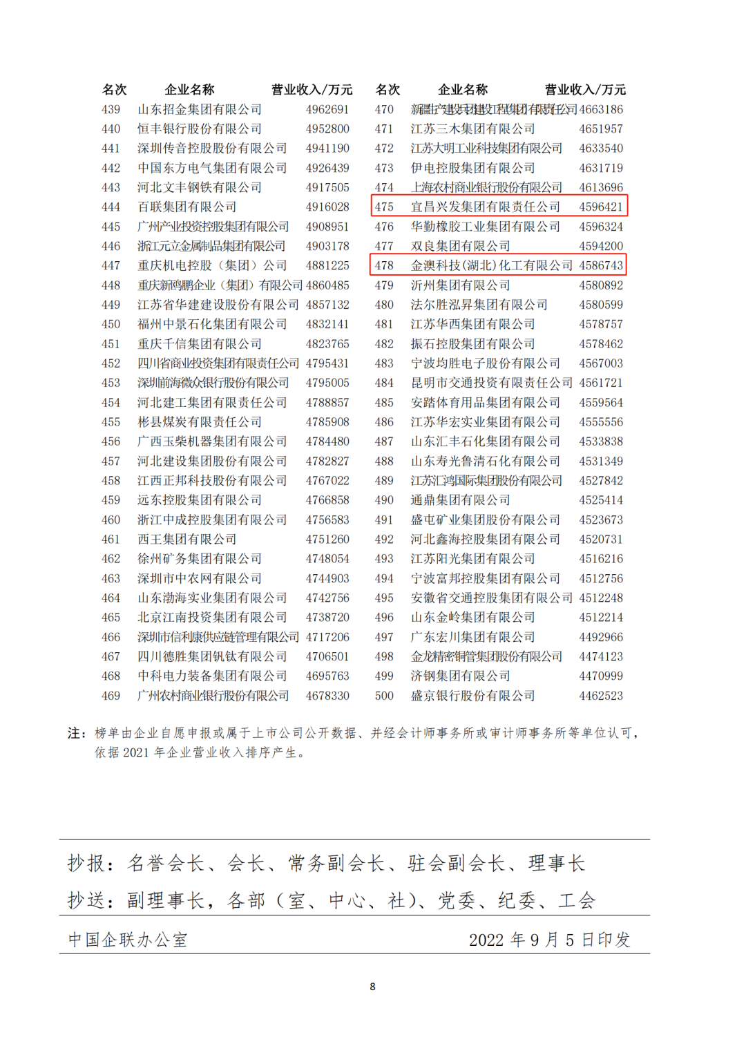 9月6日,中国企业联合会发布。2022中国企业500强榜单,湖北共有13家企业入选,跟去年相比,新增5家企业,其中宜昌2家企业入选。