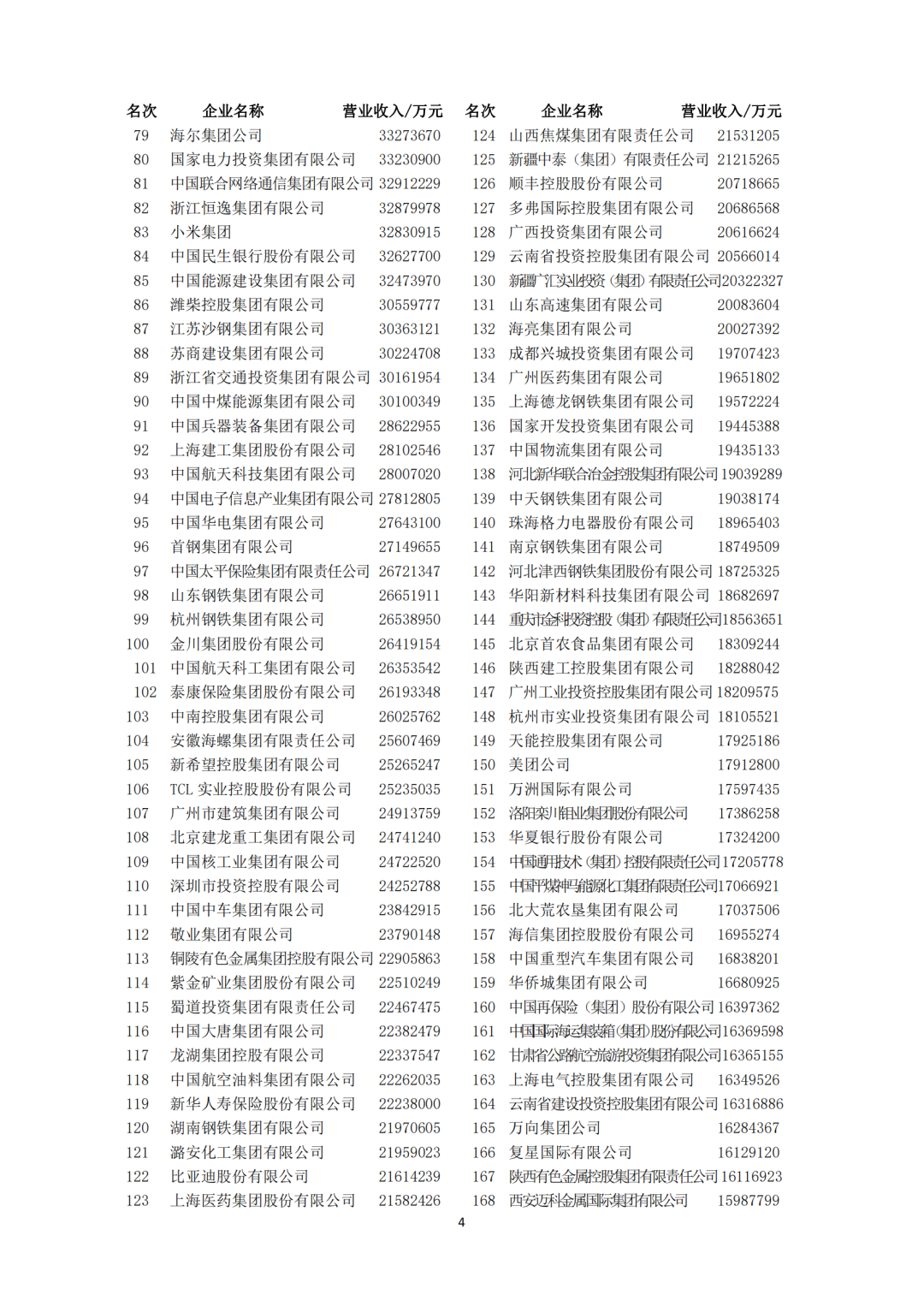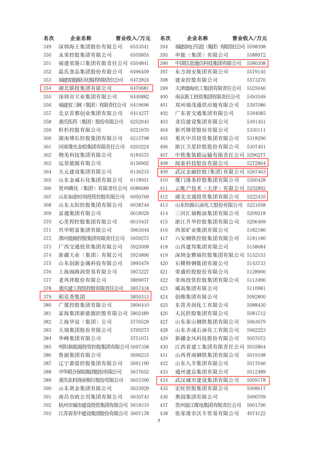 湖北13家入选的企业分别是东风汽车集团有限公司(第40位)、卓尔控股有限公司(第202位)、九州通医药集团有限公司(第207位)、恒信汽车集团有限公司(第290位)、湖北联投集团有限公司(第354位)、稻花香集团(第379位)、中国信科(第396位)、闻泰科技股份有限公司(第408位)、武汉金融控股(集团)有限公司(第409位)、湖北交通投资集团有限公司(第412位)、武汉城市建设集团有限公司(第434位)、宜昌兴发集团有限责任公司(第475位)、金澳科技(湖北)化工有限公司(第478位)。