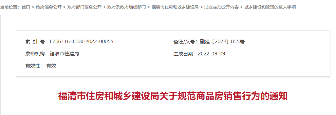 为持续规范我市商品房销售行为,提高交付品质,保障购房人合法权益,促进房地产市场平稳健康发展,9月16日,福清市住房和城乡建设局发布《关于进一步规范新建商品房销售行为的通知》。