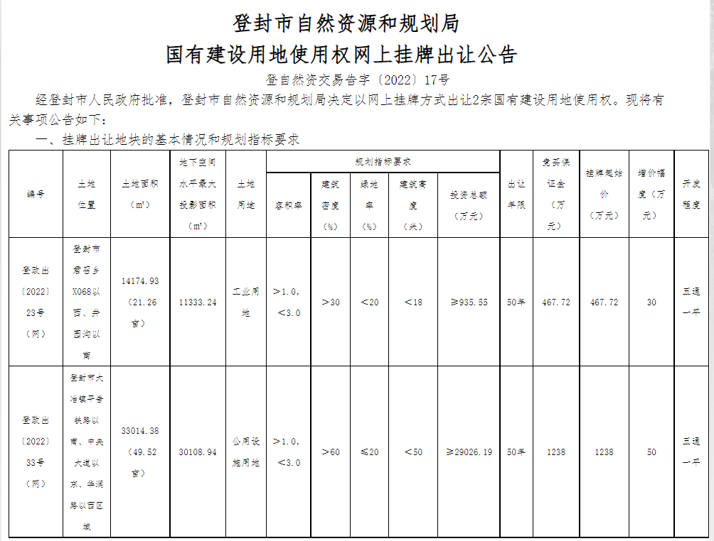 登政出〔2022〕33号(网)地块,位于登封市大冶镇平告铁路以南、中央大道以东、华润路以西区域,使用权面积33014.38平方米(49.52亩),土地用途为公用设施用地,容积率>1.0,<3.0,出让年限50年,起始价1238万元,竞买保证金1238万元。