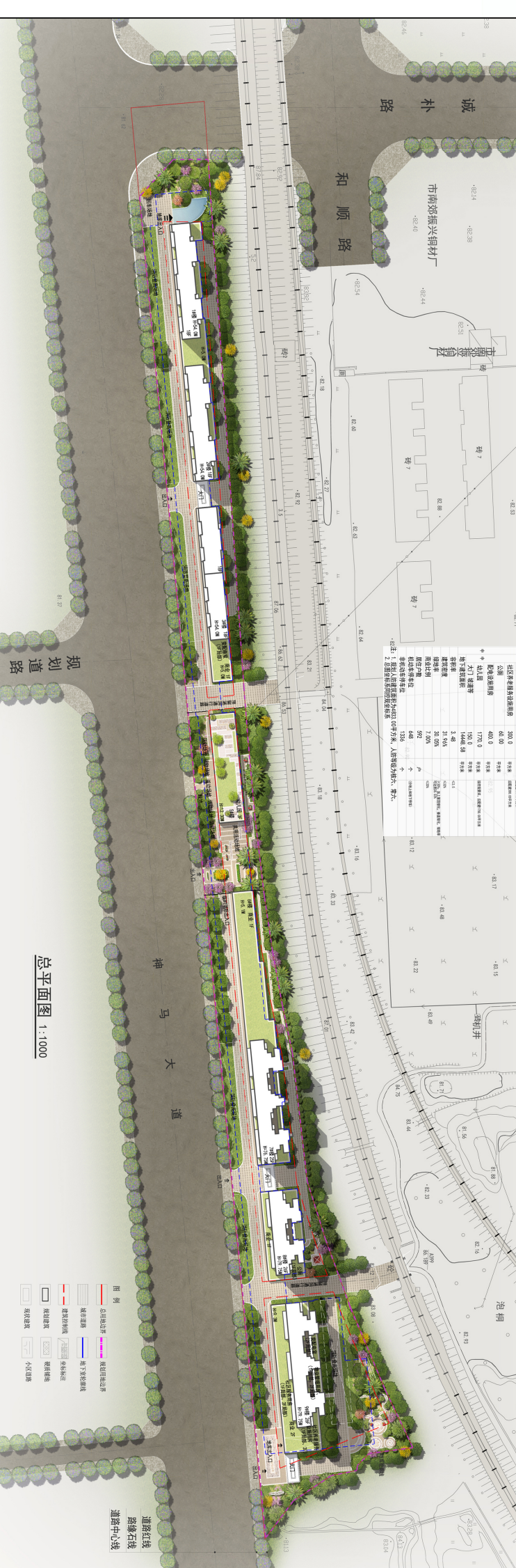 由于地块东西窄长,西部中间预留有神马大道通往和顺路的涵洞道路,中间建有幼儿园和商业设施。因此,本项目分为西侧、中间、东侧3个地块。拟建6栋高层底商住宅楼以及幼儿园等设施。