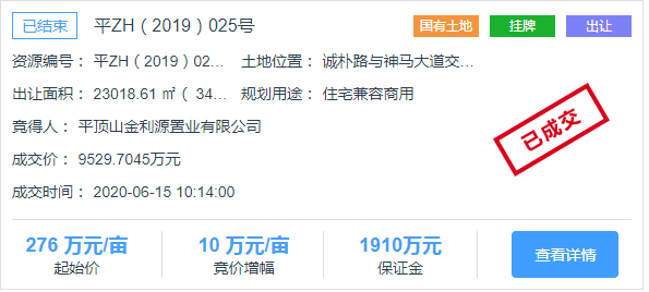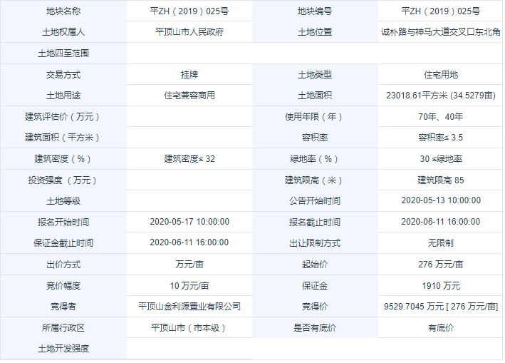 这宗地块早在2020年6月15日挂牌出让时,就被平顶山市金利源置业有限公司拿下。当时的起始价是每亩276万元,成交单价也是276万元,总价款是9529.7万元。地块用途是住宅兼容商用,根据容积率和成交单价来算,其楼面价约为1190元/平。