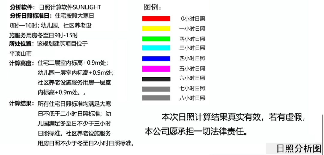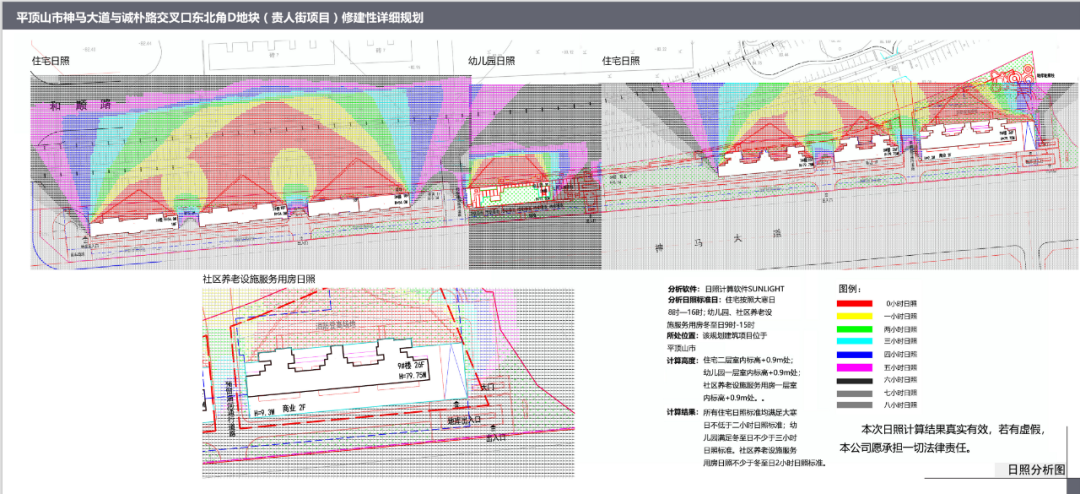 一是出现了日照分析图。这个分析图较为专业,包括笔者在内可能许多人看不明白,但其中的计算结果是:所有住宅日照标准均满足大寒日不低于2小时日照标准,幼儿园满足冬至日不少于三小时日照标准,社区养老设施服务用房日照不少于冬至日2小时日照标准。
