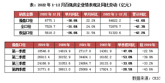 2022年12月,TOP100房企实现销售操盘金额6775.1亿元,环比增长22.2%,增幅低于往年同期;同比降低30.8%,降幅较10、11月提升。累计业绩来看,百强房企1-12月实现销售操盘金额64622.2亿元,同比降幅保持在41.6%的较高水平。