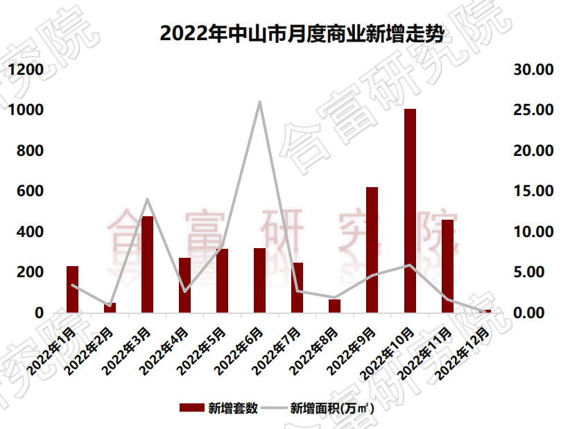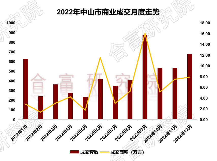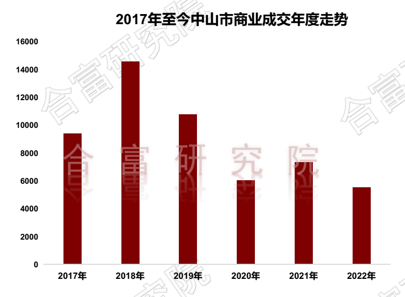 根据合富研究院监测,2022年中山市商业成交5535套,70万㎡,同比去年下降25%。
