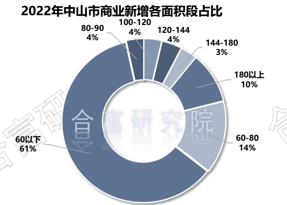 在2022年中山市商业新增各面积占比中,60㎡以下面积段新增最多,占比61%,其次是60-80㎡以上占比14%。
