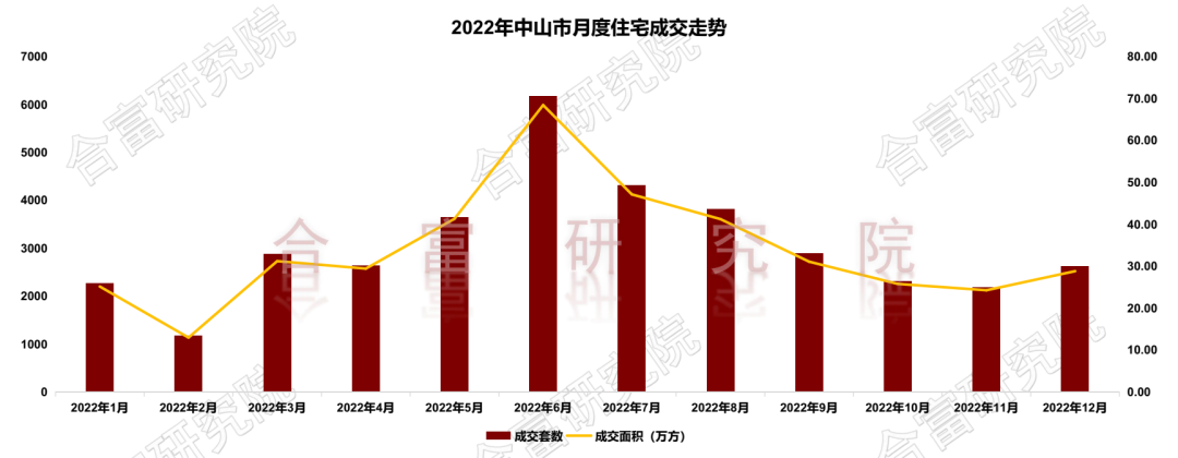 根据合富研究院监测,2022年住宅成交36886套,同比下降29%。全年月均成交为3074套,月均成交面积33.86万㎡。