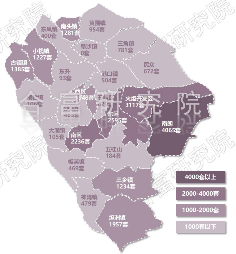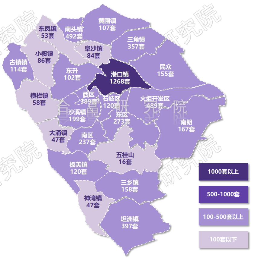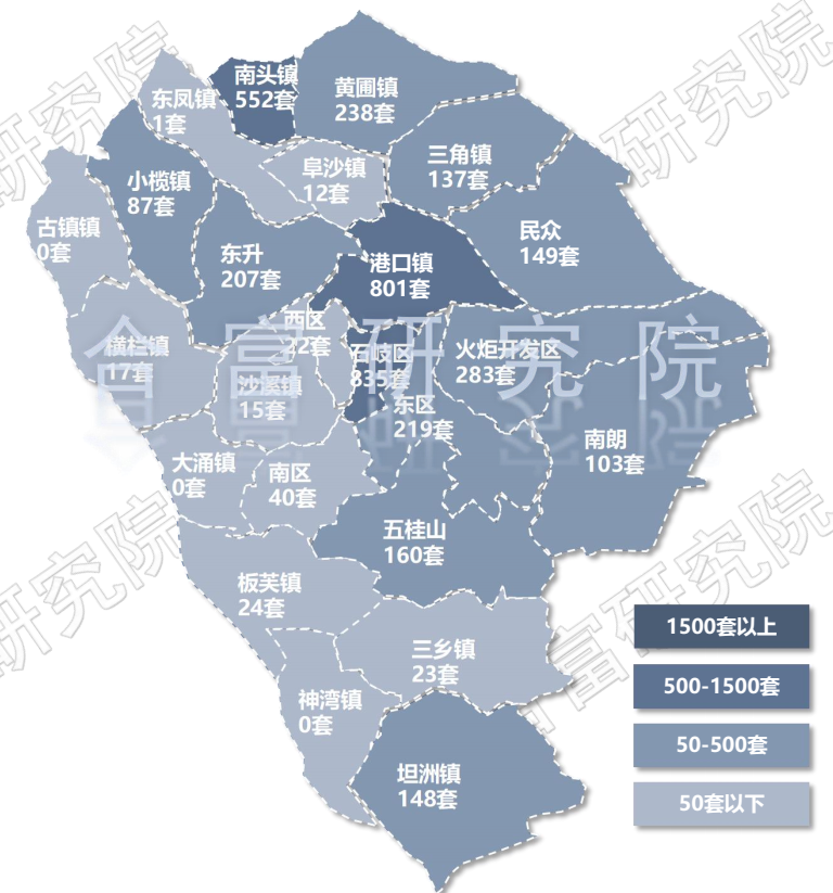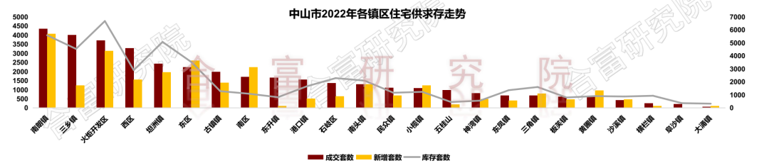 从各镇区供求来看,东区、南区、小榄、三角、黄圃及沙溪6个镇区新增大于需求,比2021年减少7个。