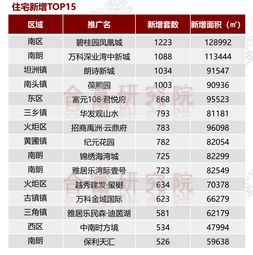 根据合富研究院监测,2022年中山市各楼盘住宅新增排名里,南区碧桂园凤凰城新增1223套排名第一,南朗万科深业湾中新城新增1088套排名第二,坦洲镇朗诗新城新增1034套排名第三。