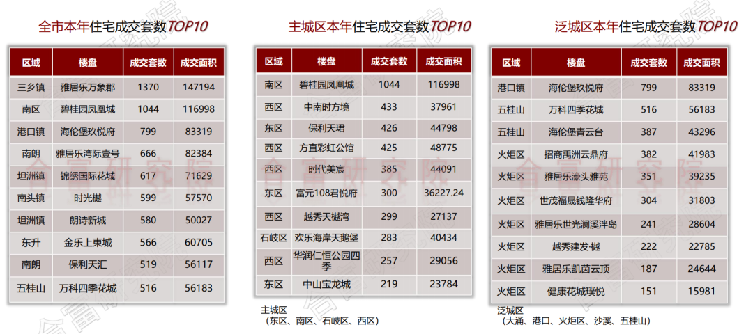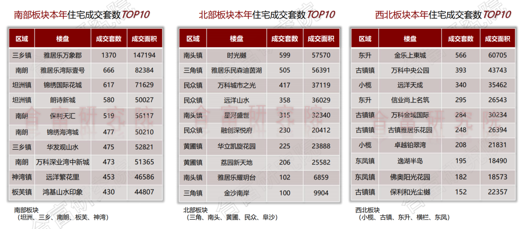 在成交方面,TOP3为南朗、三乡、火炬区,共计成交12042套占全市33%;