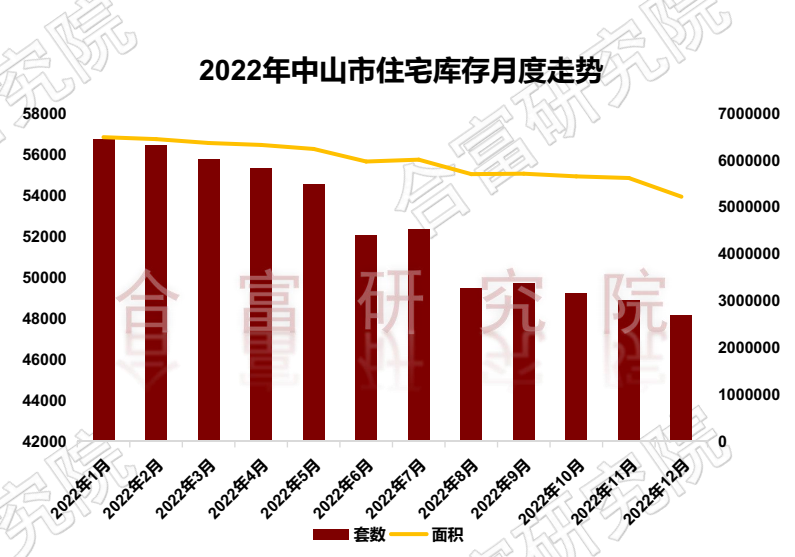根据合富研究院监测,截止2022年12月31日,中山市住宅库存48109套,522万㎡,同比去年减少10832套,下降18%。