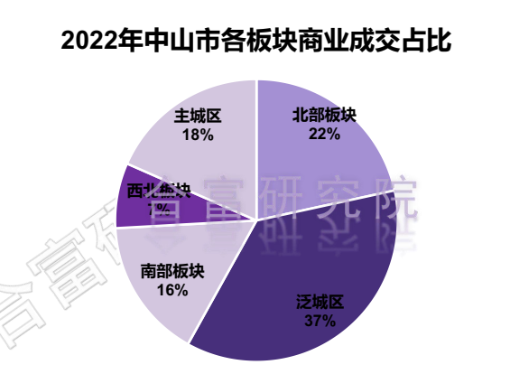 根据合富研究院监测,2022年中山市各板块商业成交,泛城区成交2019套,占比37%;北部板块成交1195套,占比22%;主城区成交1019套,占比16%。