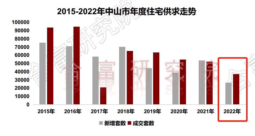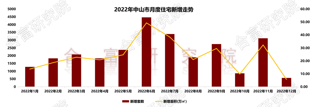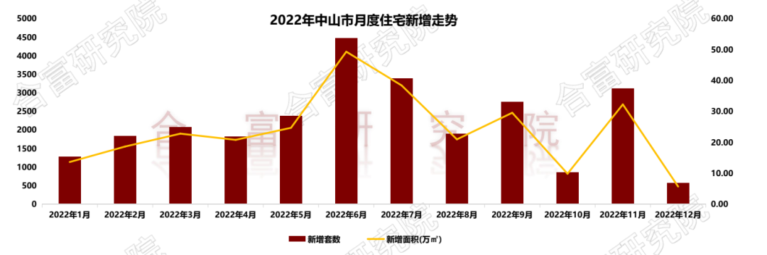 根据合富研究院监测,2022年中山住宅新增26484套,同比去年减少26876套,下降50%,新增面积287.03万㎡,同比去年减少293.74万㎡,下降51%。