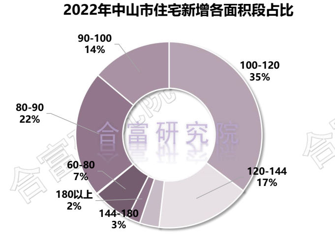 2022年中山市住宅新增各面积段占比中,100-120㎡面积段新增最多,占比35%。