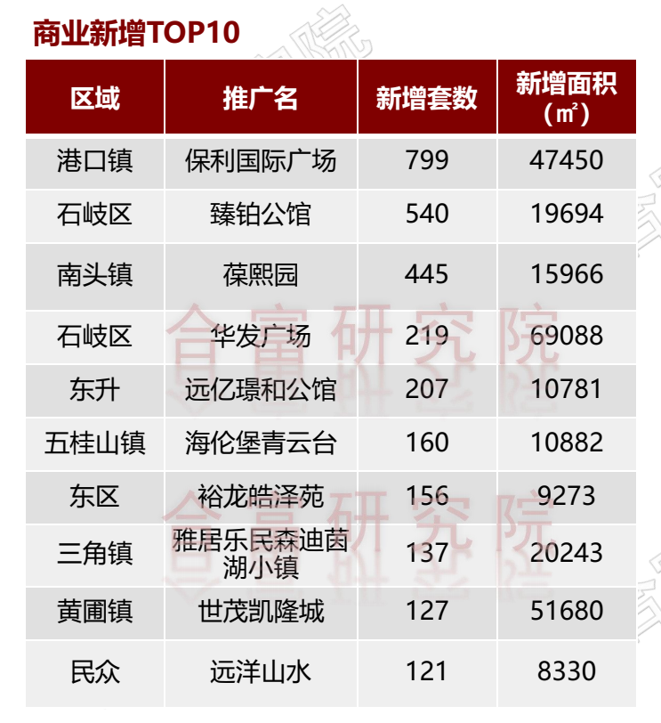 根据合富研究院监测,2022年中山市各楼盘商业新增排名里,港口镇的保利国际广场新增799套排名第一,石岐区的臻铂公馆新增540套排名第二,南头镇的葆熙园新增445套排名第三 。