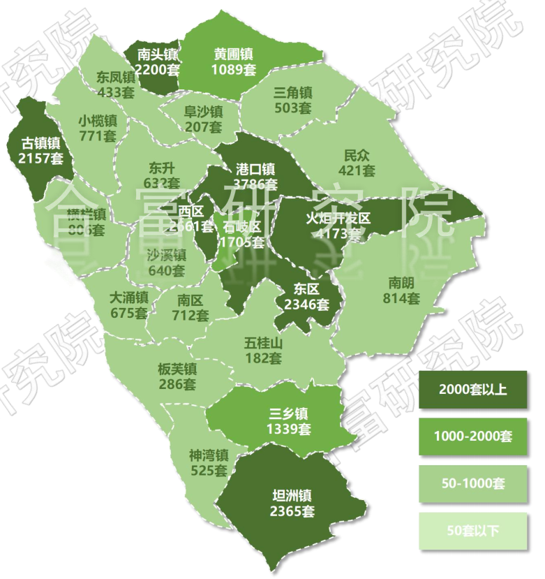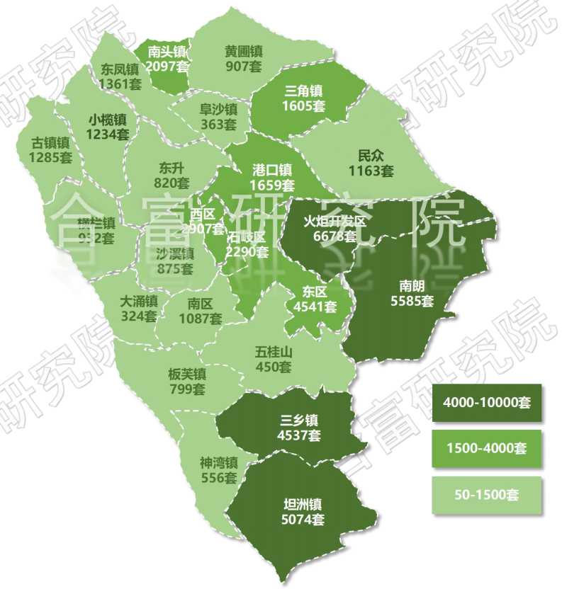 根据合富研究院监测,2022年中山市各镇区住宅库存,火炬区以6678套排名第一,同比下降8%;南朗以5585套排名第二,同比下降12%,坦洲镇以5074套排名第三,同比下降1%。