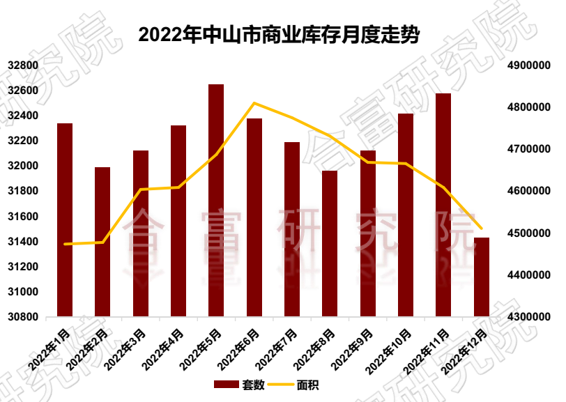 2022年中山市商业库存月度走势来看,全年库存维持在3.1-3.2万套左右,基本保持平稳。