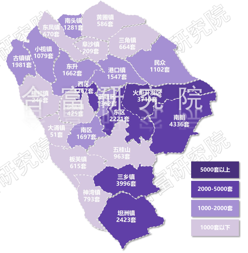 根据合富研究院监测,在2022年中山市各镇区住宅成交里,南朗成交4336套排名第一,三乡镇成交3996套排名第二,火炬区成交3710套位列第三。