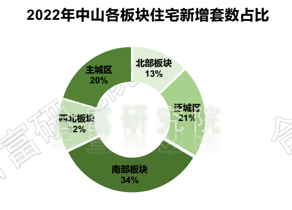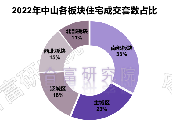 根据合富研究院监测,在2022年中山市各板块住宅成交里,南部板块连续三年排名第一,今年南部板块成交12163套,占比33%;主城区成交8547套,占比23%;泛城区成交6696套,占比18%。