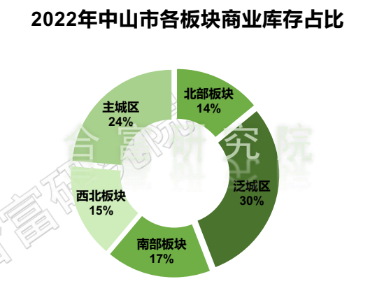 2022年中山市各板块商业库存,泛城区库存9456套,占比30%;主城区库存7424套,占比24%;南部板块库存5329套,占比17%。