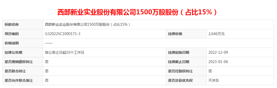 我们注意到,目前,成都新闻实业有限责任公司所持有的西部新业实业股份有限公司15%股权正在西南联合产权交易所挂牌。
